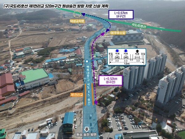 시는 우선 편도 2차로에서 1차로로 갑자기 줄어 병목현상이 발생하는 국도45호선 SK승원주유소~제1천리교 520m 구간 원삼·송전 방향으로 1개 차로를 추가, 편도 2차로로 운영키로 했다.