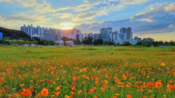 시흥시청 옆 6,000㎡ 규모의 화단은 돌과 잡초만 무성하던 공사 예정지였으나, 2년 전부터 계절마다 유채꽃, 수레국화, 코스모스 씨를 파종해 가꾼 결과, 시흥시의 대표 꽃동산으로 자리했다.
