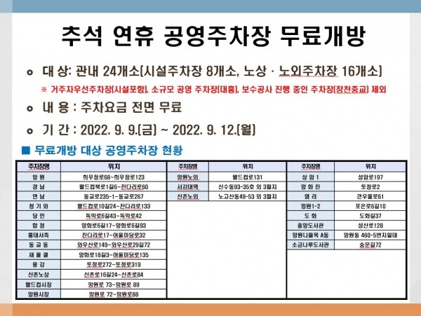 이번 주차장 무료 개방은 추석 연휴를 맞아 구민들에게 교통 편의를 제공하고 침체된 지역경제와 상권 활성화에 도움이 되기를 바라는 취지로 결정됐다.