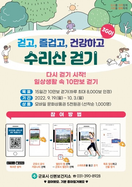 이에 따라 군포시는 ‘걷고 즐겁고 건강하고 3GO 수리산 걷기’ 사업을 통해 시민들의 신체활동을 증진하고 새로운 활력을 제공하고자 한다.