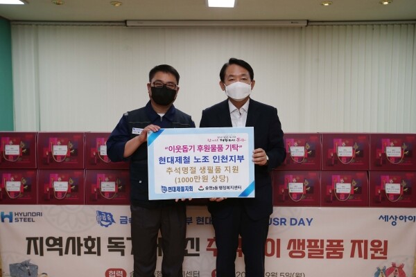 이날 현대제철 노동조합 인천지부는 송현3동을 방문해 관내 홀몸 어르신에 전달해 달라며 정성스레 마련한 치약, 샴푸, 비누 등으로 구성된 생필품 100세트를 기탁했다.