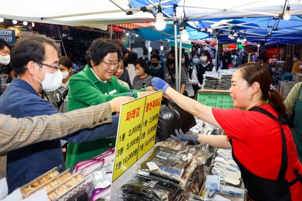 특히?코로나?여파로?힘들어하는 전통시장과 상점가 상인들의 현장을 살피고 애로사항과 불편한 사항 등을 꼼꼼히 챙기며 진심으로 위로와 격려를 전했으며 명절 준비를 위해 시장을 찾은 소비자들과 덕담을 나누며 지역화폐 이용과 전통시장을 자주 찾아줄 것을 당부했다.