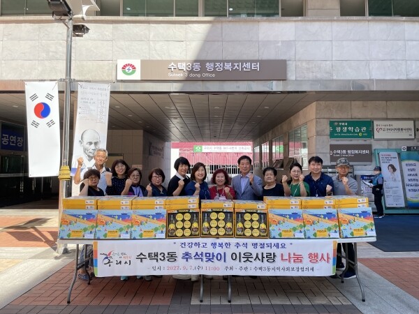 이영행 위원장은 “선물을 전달받고 기뻐하는 어르신들을 보니 흘린 땀방울이 단비처럼 느껴지는 하루였다”며 “앞으로도 도움이 필요한 곳에 도움을 드리고 이웃 간의 정이 넘치는 수택3동을 만들기 위해 노력하겠다”고 말했다.