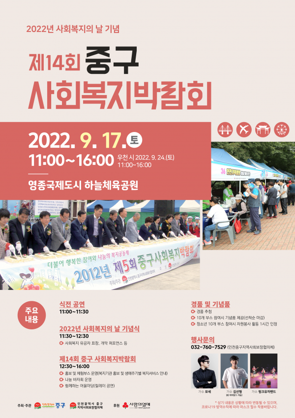 올해로 14회째를 맞이하는 중구사회복지박람회는 중구 지역 내 30여 개의 복지 관련 기관, 단체, 시설 등이 함께 참여하고 다양한 볼거리와 체험활동, 축하공연 등 화합과 나눔이 있는 축제의 장을 마련할 예정이다.