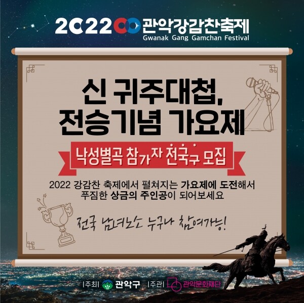 ‘낙성별곡 가요제’는 오는 10월 14일부터 3일간 관악구 낙성대공원에서 개최 예정인 ‘2022관악강감찬축제’ 대표 프로그램으로 오는 10월 15일 열린다.