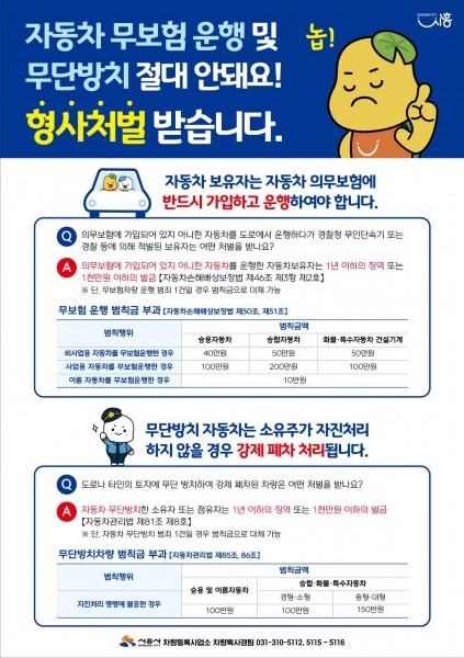 시 관계자는 “무보험 차량의 운행 및 방치만으로도 형사처벌 대상이 되는 사실을 모르는 시민이 많아 대대적인 홍보를 펼치는 만큼, 차량을 소유한 시민은 반드시 자동차 의무보험에 가입할 것을 부탁드린다”고 강조했다.