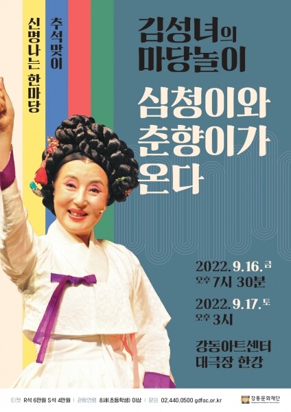 오는 16~17일 2회에 걸쳐 강동아트센터 대극장 한강에서 추석맞이 김성녀의 마당놀이 ‘심청이와 춘향이가 온다’가 개최된다.