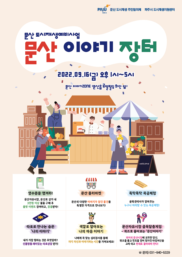 파주시 도시재생지원센터에서 진행하는 이번 행사는 2022년 문산읍 도시재생예비사업의 일환으로 조성된 ‘문산 이야기 ZONE’에서 개최되며 문산자유시장 일원의 상권 활성화를 위해 문산자유시장 상인회와 인근 상가인 로얄빌딩 운영위원회뿐 아니라 주민협의체 등 지역 주민들이 함께 협력해 준비한 행사다.
