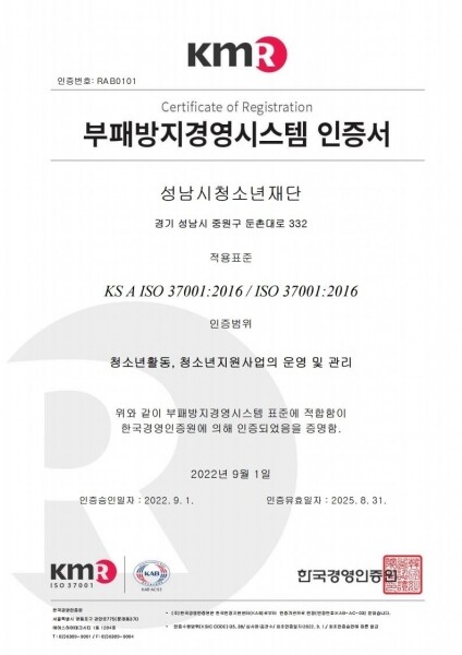 이를 위해 성남시청소년재단에서는 인증을 위한 TFT를 구성하고 인증에 필요한 교육과 제반 요구사항 충족을 위해 노력했으며 부패방지 방침과 매뉴얼, 지침서 등 인증에 필요한 요소들을 구성하고 제정했다.