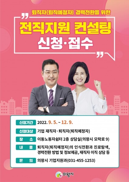 ‘전직지원 컨설팅’은 퇴직자 및 퇴직예정자의 퇴직에 대한 불안감을 해소하고 새로운 진로탐색을 위한 경력전환방법 제시, 정보제공 등 맞춤형 컨설팅을 지원한다.