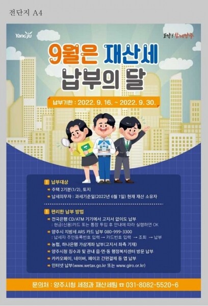 시는 시민들이 납부 기한 내 재산세를 납부할 수 있도록 양주시 홈페이지, 현수막, 전광판 등으로 홍보하고 민원인들이 재산세에 대해 쉽게 이해할 수 있도록 리플릿을 제작해 시청 세정과에 비치할 예정이다.
