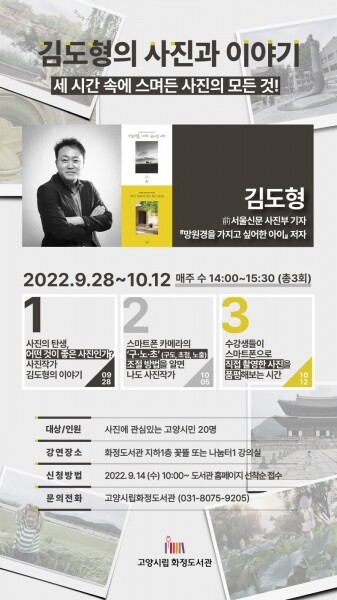 이번 강연은 ‘김도형의 사진과 이야기: 세 시간 속에 스며든 사진의 모든 것’이라는 주제로 오는 9월 28일부터 10월 12일 매주 수요일 오후 2시~15:30 총 3회에 걸쳐 진행된다.