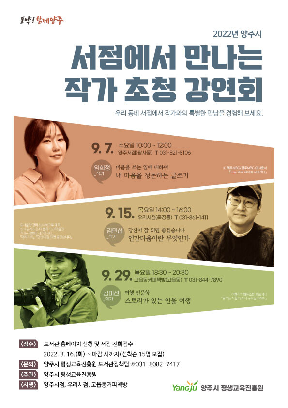 참여신청은 양주시 도서관 홈페이지 를 통해 가능하며 선착순으로 강연별 15명을 모집한다.
