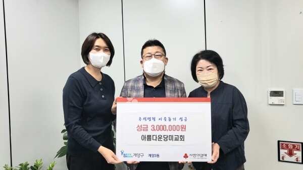 계양3동 강명주 동장은 “아름다운당미교회의 꾸준한 나눔활동이 어려운 이웃에게 큰 힘이 되는 동시에 지역 사회의 귀감이 되고 있다”며 “기탁해 주신 성금은 감사의 마음을 담아 어려운 이웃에게 전달하겠다”고 말했다.