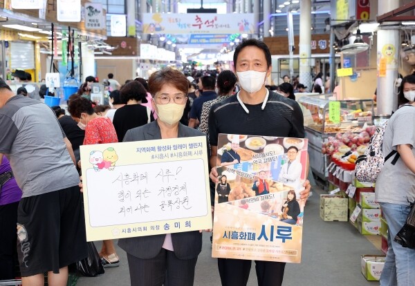 이에 송 의장은 시흥시 전통시장 중 한 곳인 삼미시장을 찾아 코로나19 및 경기 침체로 어려움을 겪고 있는 상인들을 격려하고 삼미시장상인회장과 ‘시흥화폐 시루 힘이 되는 가정경제, 피어나는 골목상권’이라는 문구를 적은 피켓을 들고 찍은 사진을 자신의 SNS에 게시했다.