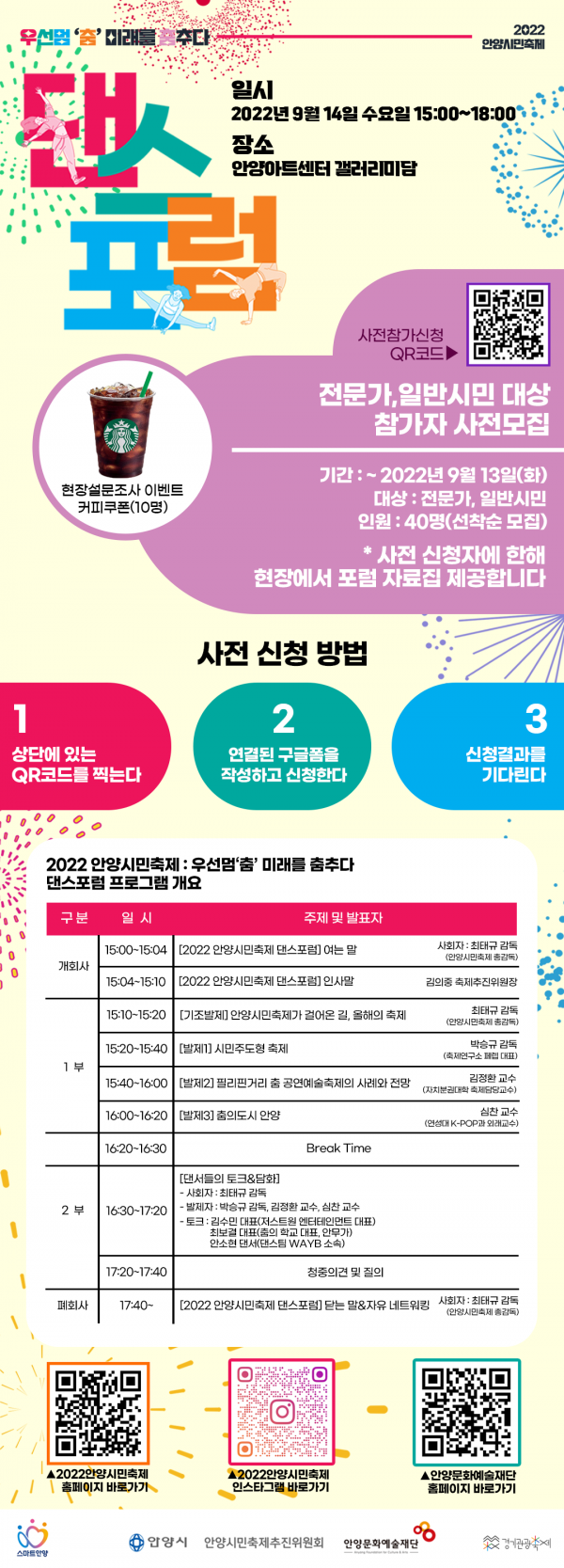 이번 포럼은 춤을 주제로 하는 안양시민축제의 공감대 형성과 발전 모색을 주제로 초청자 발제와 댄서들의 자유토론으로 나눠 2부로 진행된다.