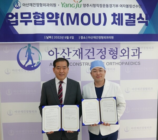 이날 체결식은 고읍동에 위치한 아산재건정형외과의원 3층 본관에서 진행했으며 이번 협약으로 양주시청 직장운동경기부 여자볼링선수단은 아산재건정형외과의원에서 체계적인 건강관리와 특화된 스포츠 손상 치료 및 재활 프로그램을 제공받는다.