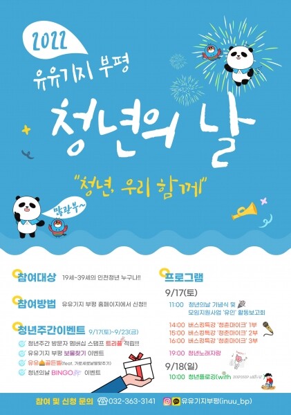 유유기지 부평 관계자는 “이번 행사는 청년공간 유유기지 부평을 개소한 뒤 처음으로 진행하는 청년의 날 기념행사”며 “코로나19 장기화로 지친 지역 청년들에게 힐링의 시간을 전할 수 있는 행사가 될 것으로 기대한다”고 말했다.