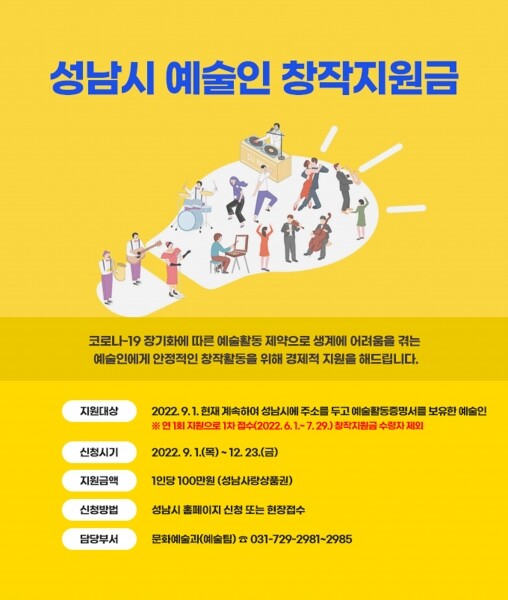 2차 지급 대상은 9월 1일 공고일을 기준으로 계속해서 성남시에 주소를 둔 시민이면서 한국예술인복지재단에 등록돼 신청일 기준 예술활동 증명서가 유효한 예술인이다.