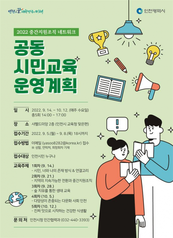 매주 수요일 진행되는 이번 교육은 시민, 너와 나의 존재 방식과 연결고리 지역의 지속 가능한 전환과 중간지원조직 숲 치유를 통한 생태 교육 다양성이 존중되는 다문화 사회 인천 진짜 맛으로 시작하는 건강한 식생활 등 총 5개 강연으로 각 중간지원조직의 인적 자원과 네트워크 자원을 활용해 발굴한 내용으로 꾸려진다.