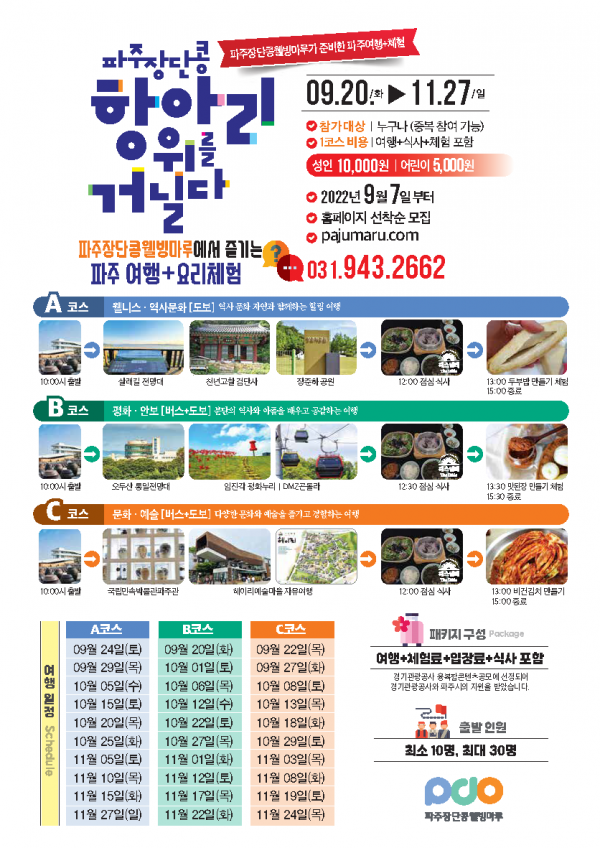 이번 투어 프로그램은 경기도와 경기관광공사에서 주관한 ‘2022년 역사·문화·생태·평화+관광 융합콘텐츠 개발 공모사업’에 선정된 사업으로 파주시 통일동산 관광특구 및 인근 주요 관광지 투어와 함께 파주 농산물을 활용한 음식 체험을 함께 즐길 수 있는 3가지 테마의 코스로 운영된다.
