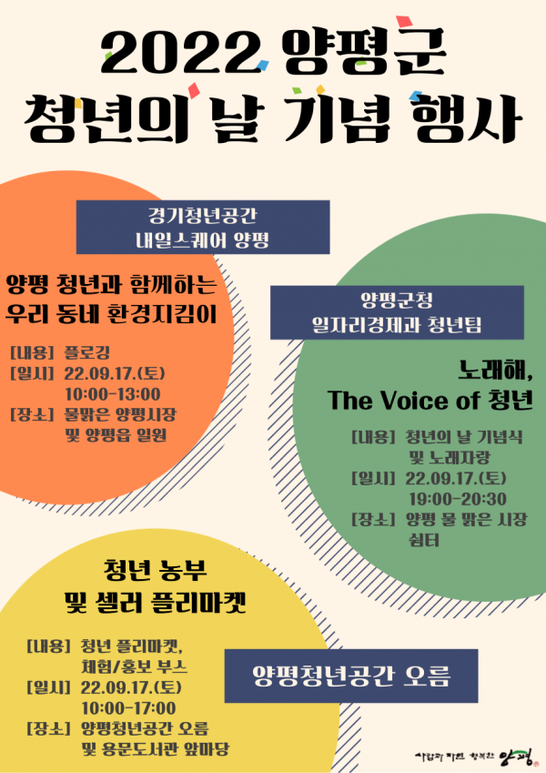 개그맨 손헌수와 조승제가 사회를 맡아 진행하는 이날 행사에는 슬리피가 초청가수로 출연하며 청년 동아리 ‘양평열린문화터’의 무용 공연과 청년 노래자랑이 펼쳐진다.