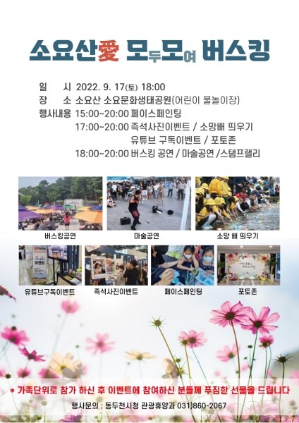 이번 행사는 가족과 함께하는 “소요산愛 모모 버스킹”으로 페이스페인팅, 스탬프랠리, 버스킹 및 마술공연 등 더욱 풍성한 공연과 이벤트가 진행된다.