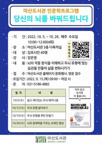 1주차 ‘쉽고 재미있는 두뇌 메커니즘’, 2주차 ‘두뇌 유형 알아보기’, 3주차 ‘두뇌 유형별 루틴 만들기’, 4주차 ‘뇌의 잠재력을 키우는 브레인 명상’으로 구성되며 자세한 내용은 마산도서관 홈페이지 문화행사 신청에서 확인할 수 있다.
