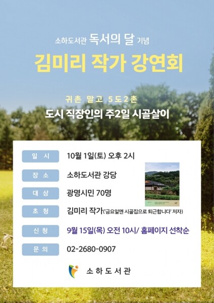 소하도서관 관계자는 “마주보다, 책보다를 표어로 진행되는 올해 독서의 달을 기념하기 위해 저자초청 강연회, 가족 문화공연 등 다양한 프로그램을 진행할 예정이다”며 “많은 시민이 도서관에서 따뜻한 가을을 맞이하길 바란다”고 전했다.