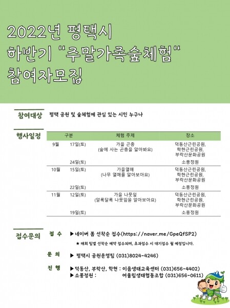 오는 17일부터 11월 19일까지 4개소 공원에서 총 24회에 걸쳐 전문가 해설과 함께하는 가족숲체험이 진행될 예정이다.