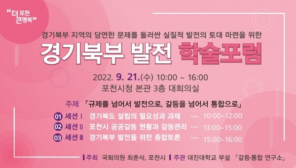 이번 포럼은 최춘식 국회의원과 포천시가 주최하고 대진대학교 부설 ‘갈등·통합 연구소’가 주관하며 ‘규제를 넘어서 발전으로 갈등을 넘어서 통합으로’라는 주제로 진행한다.