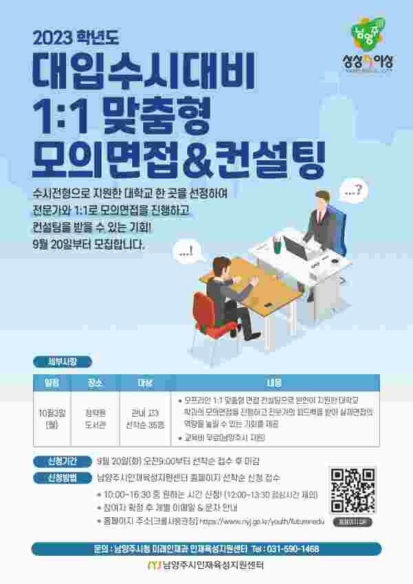 오프라인 면접컨설팅과 온라인AI면접컨설팅은 행사를 주관한 남양주시 미래인재과 인재육성지원센터 홈페이지에서 회원가입 후 9월 20일 9시부터 각각 신청할 수 있다.