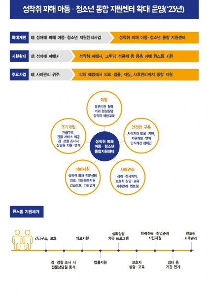 ‘성착취 피해 아동·청소년 통합 지원센터’ 확대 운영 : 기존 ‘성매매 피해아동·청소년 지원센터’의 기능을 성착취 피해예방부터 의료·법률, 심리치유, 사후관리까지 확장해 체계적·종합적으로 지원한다.