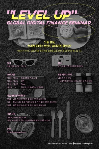 ‘레벨업 Level up’이란 이름으로 진행되는 이번 세미나는 10월에 남미 11월 동남아시아 12월 유럽의 전문가를 통해 디지털금융 산업 최신트렌드에 대해 알아볼 예정이다.
