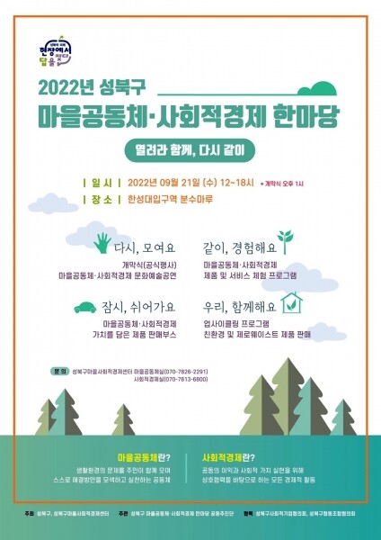 이승로 성북구청장은 “이번 행사를 통해 지역주민이 마을공동체와 사회적경제의 가치를 이해하고 우리 지역에 대한 관심 속에 서로 화합하는 경험을 하기를 바란다”고 밝혔다.