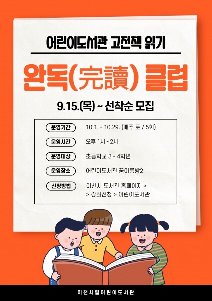 10월1일부터 10월29일까지 매주 토요일 5주동안 운영하는 이번 완독클럽에서는 ‘샬롯의 거미줄’을 완독할 예정이며 다양한 독후 활동과 함께 낭독, 토론을 통해 어린이들이 고전책과 친해질 ㄴ도서관 관계자는 “참여 어린이들의 완독클럽 참여를 통해 숨겨진 보물 같은 고전책을 발견하고 독서의 중요성을 인식하는 계기가 되길 바라며 앞으로도 어린이들이 책과 함께 성장할 수 있는 환경 조성에 노력하겠다”고 밝혔다.