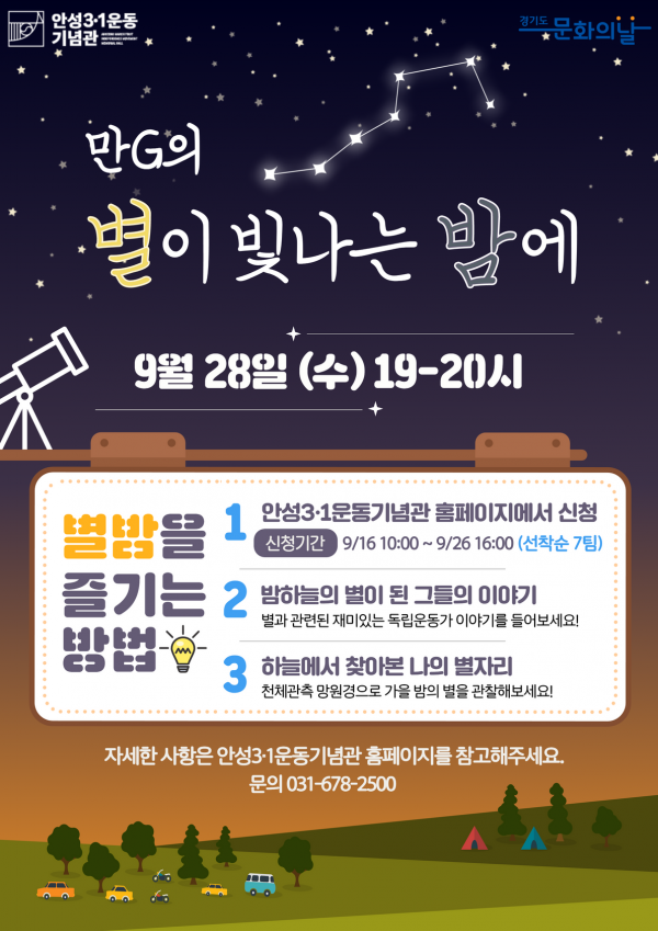 안성3·1운동기념관에서 진행되는 9월 문화의 날 ‘만G의 별이 빛나는 밤에’에 참여하고 싶은 참가자는 9월 16일 10시부터 안성3·1운동기념관 누리집을 통해 선착순으로 신청할 수 있다.