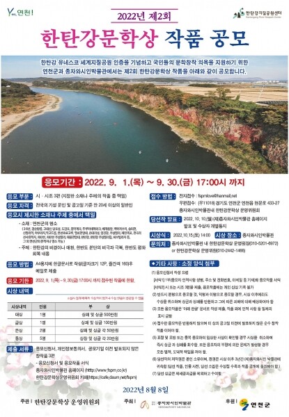올해 한탄강 문학상의 주제는 한탄강의 비경이나 애환, 한반도 분단의 비극과 극복 그리고 한반도 평화회복 내용으로 공모기일 이전까지 발표되지 않은 창작품 시 또는 시조부분 3편을 응모할 수 있다.