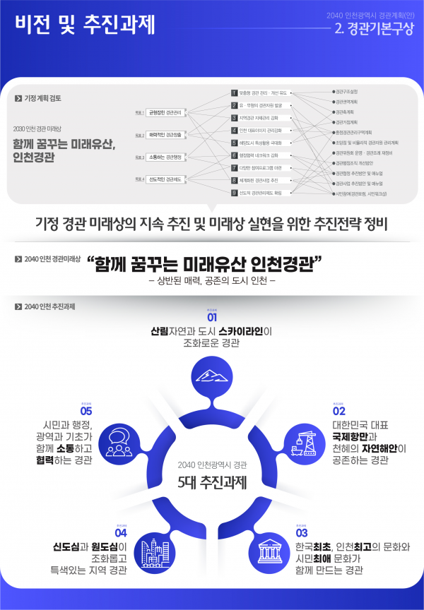 2040 인천광역시 경관계획에는 ‘함께 꿈꾸는 미래 유산, 인천경관’을 미래상으로 산림과 도시 스카이라인이 공존하는 경관 대한민국 대표 국제 항만과 천혜의 자연해안이 공존하는 경관 한국최초, 인천최고의 문화와 시민최애 문화가 함께 만드는 경관 신도시와 원도심이 조화롭고 특색있는 지역 경관 시민과 행정, 광역과 기초가 함께 소통하고 협력하는 경관을 만들어가기 위한 실천전략이 담겨있다.