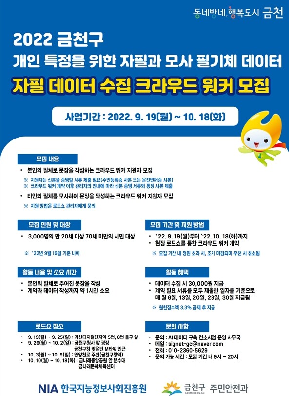한편 이번 사업은 과학기술정보통신부가 주관하고 한국지능정보사회진흥원이 추진하는 ‘2022년 인공지능 학습용 데이터 구축사업’에 선정돼 진행하게 됐으며 금천구는 디지털펜을 활용한 자필 데이터 수집을 위한 로드쇼 장소 제공 및 AI 학습 데이터 서비스 검증을 위한 수요기관으로 참여한다.