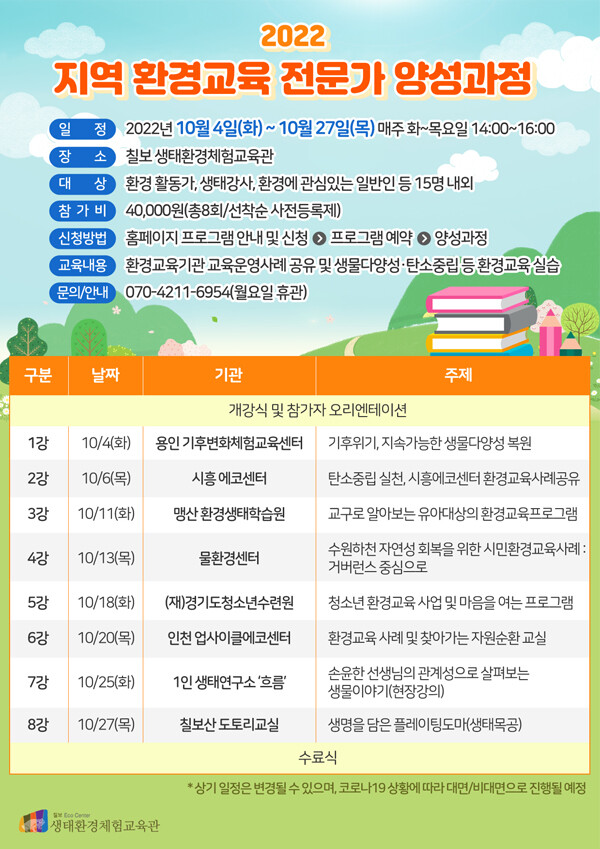 수원시 칠보생태환경체험교육관 홈페이지 ‘프로그램 안내 및 신청→프로그램 예약’에서 ‘지역 환경교육 전문가 양성과정’을 선택해 신청하면 된다.