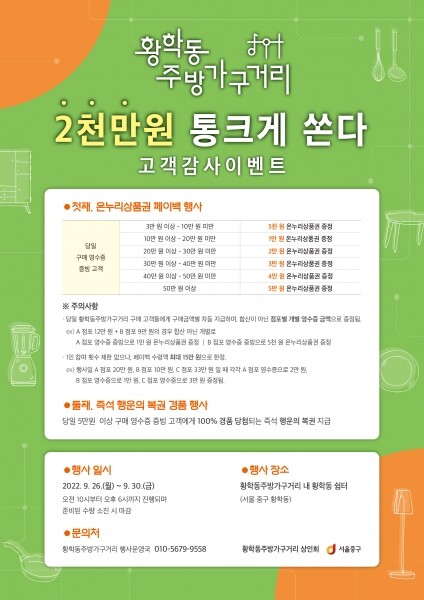 상품권과 복권은 주방가구거리 행사 참여 점포에서 당일 구매한 고객들에 한해 지급되며 구매 영수증을 가지고 황학 마을쉼터 행사 부스를 방문하면 이벤트에 참여할 수 있다.