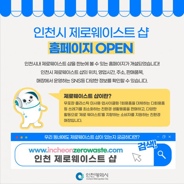 인천광역시는 자원순환 문화 확산과 쓰레기를 남기지 않는 환경 친화적 소비생활 활성화를 위해 내가 사는 동네에 제로웨이스트샵이 어디 있는지 쉽게 확인 할 수 있는 ‘인천 제로웨이스트 샵 홈페이지’를 개설했다고 밝혔다.