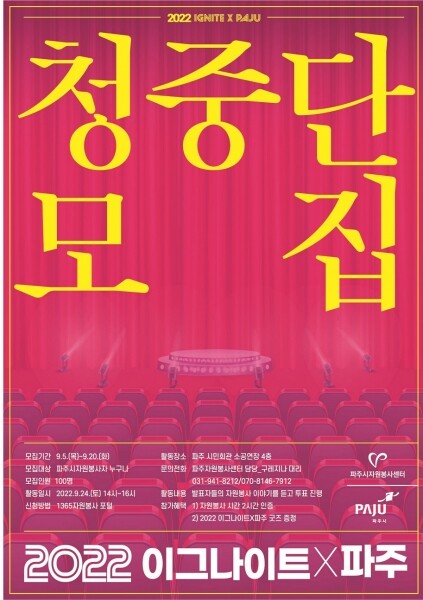 신청은 365자원봉사 포털사이트에 게시된 ‘2022 자원봉사 이그나이트-파주 청중평가단 모집’ 공고를 확인해 신청하면 되고 신청 기간 이후에는 파주시 자원봉사센터로 할 수 있다.