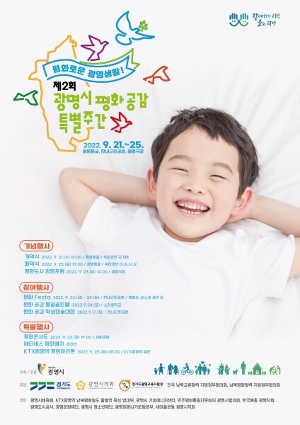그밖에 특별행사로 23일 새빛공원에서는 ‘평화콘서트’가 25일 KTX광명역 일원에서는 ‘2022 KTX광명역 평화마라톤 대회’가 열리며 특별주간 동안에는 디지털에 능숙한 MZ세대를 위한 ‘평화체험 메타버스’도 운영해 시민들에게 흥미와 재미를 더하면서 평화에 대한 공감대가 자리 잡을 수 있도록 했다.