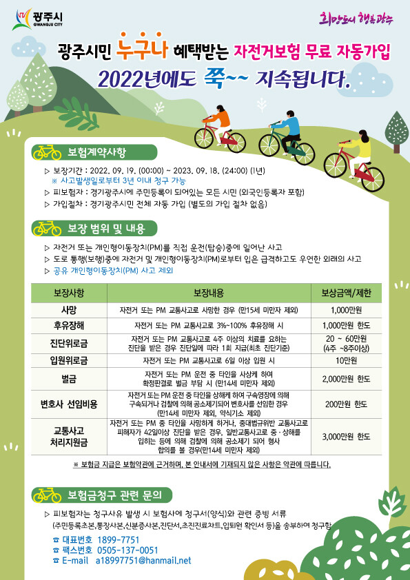 시민 자전거 보험은 시민이 안심하게 자전거를 이용할 수 있는 여건을 조성하고 사고에 따른 경제적 부담을 해소하기 위한 것으로 보장 기간은 2022년 9월 19일부터 2023년 9월 18일까지이다.