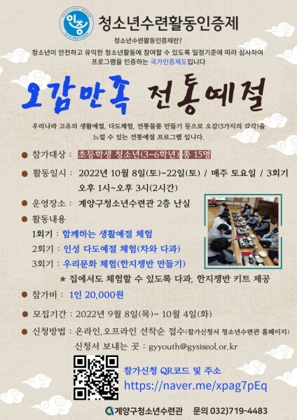 ‘오감만족 전통예절’ 프로그램은 생활 예절 교육, 다도 체험, 한지 쟁반 만들기로 구성된 청소년기 바른 인성교육을 위해 마련됐으며 특히 ‘다도 체험’은 차 예절을 배우며 전통차와 어울리는 다식을 맛볼 수 있어 참여자들에게 흥미로운 시간이 될 것으로 기대된다.