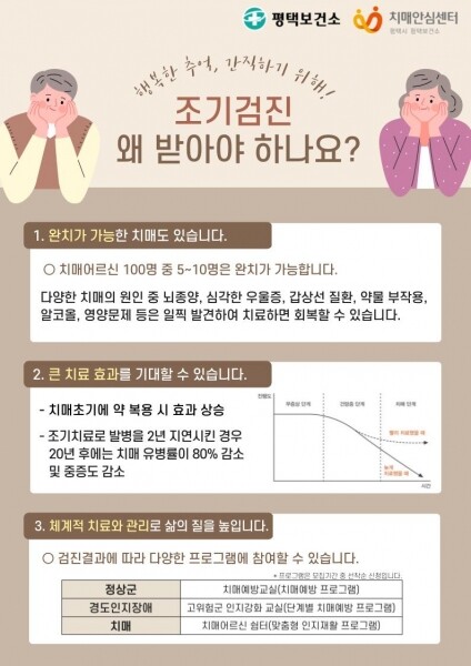 평택시 관계자는 “치매는 조기발견과 치료가 매우 중요하므로 치매안심센터를 방문하기 어려운 어르신도 검사를 쉽게 받을 수 있도록 찾아가는 경로당 치매선별검사를 추진하고 있으니 많은 어르신이 검사받으시길 바란다”고 말했다.