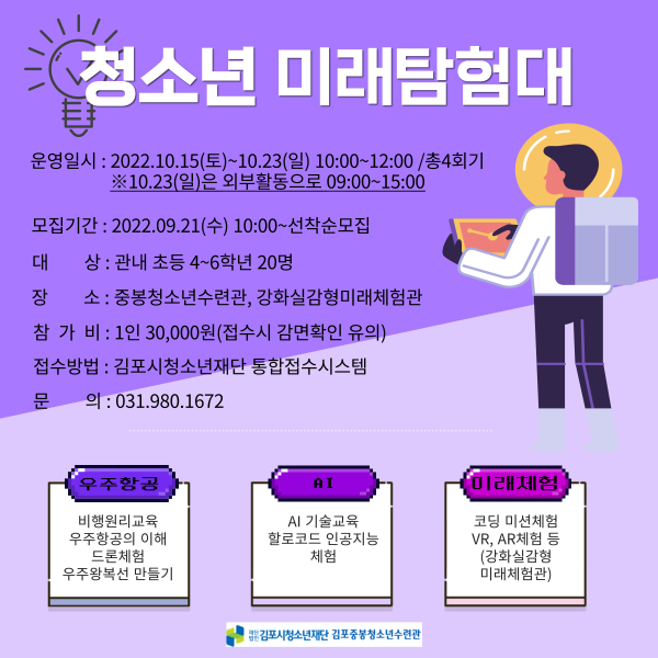 참가비는 1인 3만원으로 김포시청소년재단 홈페이지 통합접수시스템을 통해 프로그램 참가 신청이 가능하다.