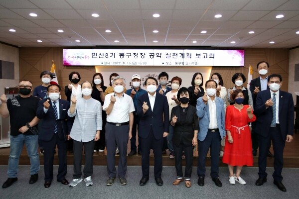 민선8기 공약사업은 인구 10만 달성, 노후 공업지역 활성화를 통한 유망기업 유치 환경 조성, 테마형 전통시장 개발 등 다시 도약하는 동구 교육인프라 확충, 동구문화재단 설립, 관광코스 개발, 화도진축제 활성화 등 역사문화로 풍성한 동구 어르신을 위한 대상포진, 일자리, 품위유지비 확대, 구강 의료복지 강화, 취약계층 의료복지 서비스 확대 등 안전하고 편안한 동구로 공약 실천계획을 확정했으며 홈페이지 등을 통해 공표하고 이행상황을 수시로 공개해 공약사업들의 실행력 강화와 주민과의 소통에 최선을 다할 계획이라고 전했다.